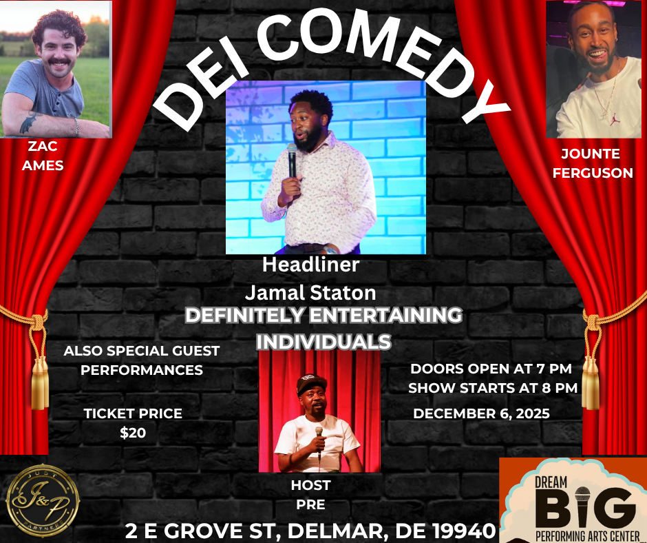 Back to All Events DEI Comedy, Saturday, December 6th - Doors Open 7 pm; Show 8 pm Saturday, December 6, 2025 8:00 PM 9:00 PM Dream Big Venues 2 East Grove Street Delmar, DE, 19940 United States (map) Google Calendar ICS DEI COMEDY:HOSTED BY: PREFEATURING: ZAC AMESFEATURING: JOUNTE “757FRESHPRINCE” FERGUSONHEADLINER: JAMAL STATON Grab A Ticket