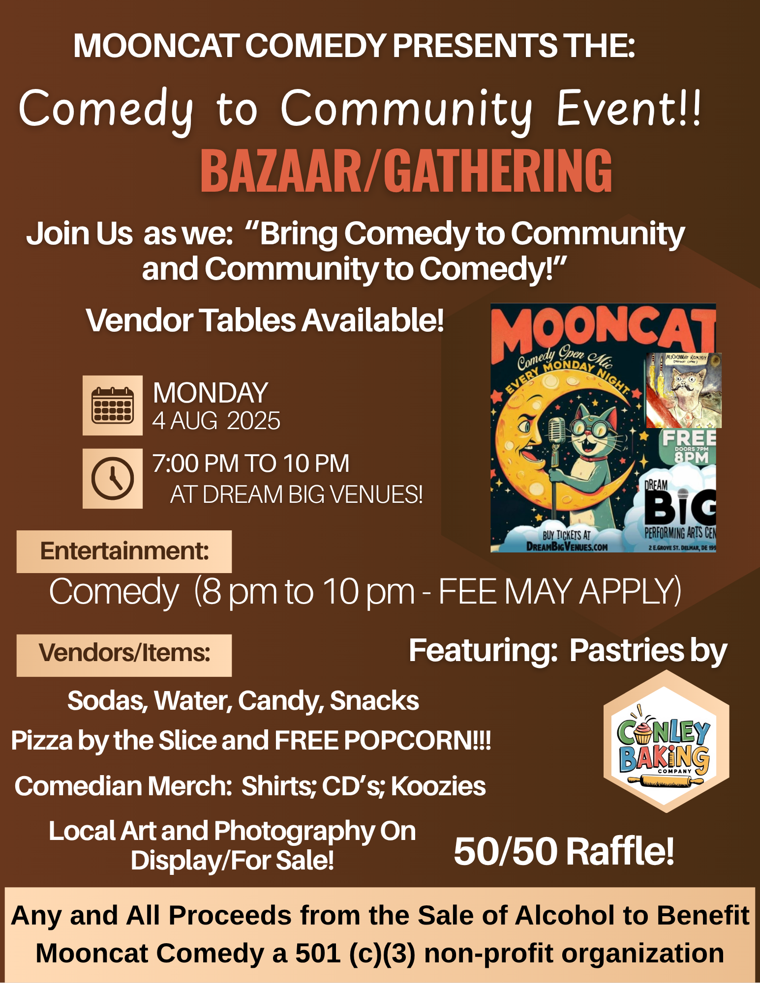 Mooncat Comedy of 501 (c) (3) non-profit organization (pending approval) will be offering a limited bar with any and all proceeds from the sale of alcohol to further our mission to: “Bring Comedy to Community and Community to Comedy”